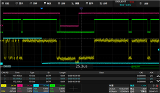 Repeat the IG ON/OFF test(turn on/off CAN communication), the error frame was observed. You can find the waveform as below. Customer tried the same test method at TCAN1043A, but not observe the error frame.