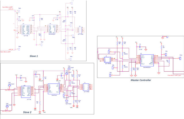 The waveform on Tx+ and Tx- lines of slaves to Master controller found to be clipped on negative side thereby not crossing (-200mV as per Receiver's expected voltage threshold). Kindly review my circuits in attached picture and let me know why this full duplex network not working as expected (with one Master and two slaves). Thanks in advance..