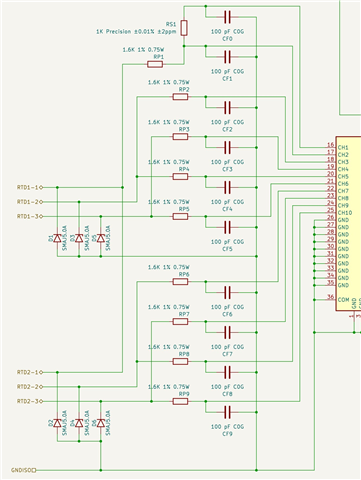 I should explain that while it is normally not expected 24V continuously at the RTDs inputs, we wanted to consider the cases of misconnections and shorts of the system’s power source with the RTDs wiring. We implemented then series resistors between the TVSs and the protected IC. We calculated that those 1.6Kohm resistors at 24VDC will provide at most 15mA which is permitted by the IC on its channels according to its datasheet. It may also be worth to note that the resistors are not affecting negatively the accuracy sensor, which as we have learnt, is a usual compromise in these cases.