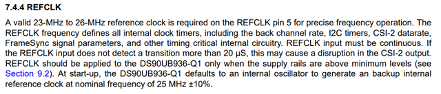 We have one scenario is that 935/936 are normally work in the beginning with using 936 external REFCLK. But due to some reasons, the 936 external REFCLK is stopped, but the 935/936 can still transmit the data, but the FPD-link seems to be unstable.