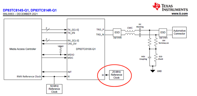 1. For DP83TC814S-Q1, if the customer is using RMII slave mode, how should the MCU side be connected when they clock the PHY using an external active crystal?