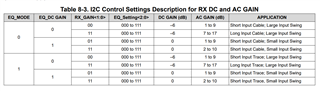- For the same input signal (same Vin_amp), how should the SN65DP141 be configured in order to achieve maximum vout_amp amplitude? If the EQ_DC_GAIN=0DB, EQ_AC_GAIN=15DB, TX_DC_GAIN=6DB, the maximum VOUT_AMP output amplitude can be made (regardless of the output amplitude being limited by the IC), Right?
