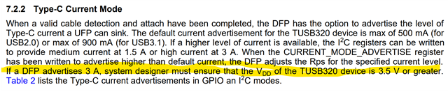 For TUSB320 device to advertise 3A, TUSB320 Vdd has to be 3.5V or greater. Assuming all steps to configure the CSR registers using the I2C mode is correct, it is likely that the device is not given the correct Vdd to advertise 3A based on the design you provided.