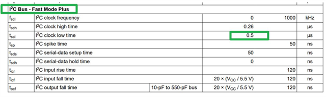 The customer can not use FAST MODE PLUS, because this mode needs 1.8V power supply and my customer's hardware is fixed. even the frequency can be 1MHZ, SCL low is 1/(1M*2)=0.5us, there is no margin as well.