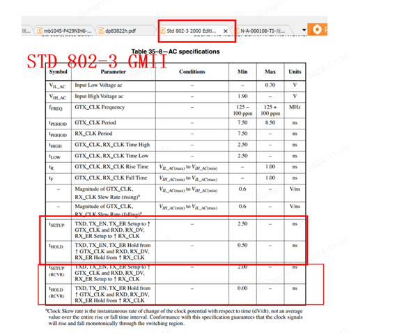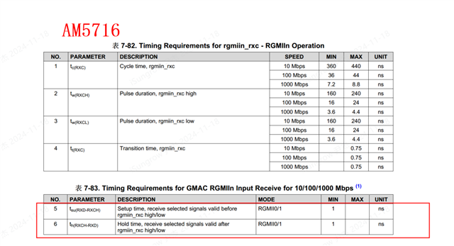 Another question is the difference between the AM5716 specification and the 802-3 standard.The 802-3 standard shows that the setup/hold time are 2ns/0ns, and the rise/fall time is 1ns/1ns. However, the AM5716 specification shows that the setup/hold time are 1ns/1ns, and the rise/fall time is 0.75ns/0.75ns.These differences confuse me. Could you give some comments.