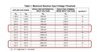 Looking at the maximum receiver input voltage thread table as shown below, for example, if we apply 1V on VIA and 0V on VIB or vice versa, we will get a H or L on the output, so this is basically the DC signaling rate which we drive a constant voltage at the inputs. In this case the SN65CML100 will support the minimum of DC signaling rate.