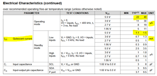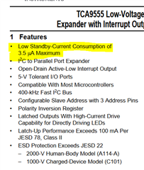 From the TCA9555's datasheet, for low inputs, the quiescent current in standby mode is 1.5mA max while it is 40µA max for operating mode. The quiescent current is then much higher in standby mode than in operating mode. It doesn't seem consistent, especially as the datasheet says “Low Standby-Current Consumption of 3.5 μA Maximum” on the first page. Is this an error on the datasheet ? Is it 1.5µA instead of 1.5mA?