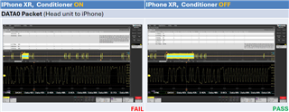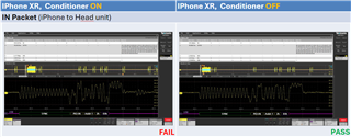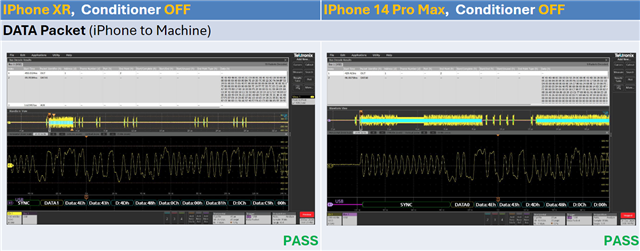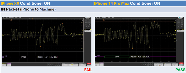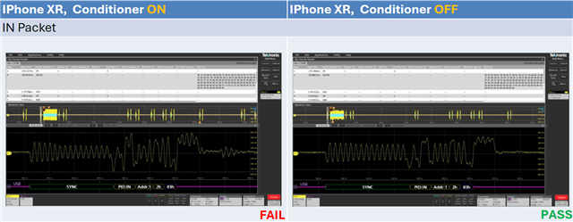 Further analysis of the CarPlay connection packets revealed that the packets sent from the iPhone to the CPU exhibit significant attenuation and distortion during compensation by the TUSB211A-Q1. However, when we disconnect the Vcc of the TUSB211A-Q1, we observe better signal performance. It is worth noting that the attenuation and distortion caused by the TUSB211A-Q1 do not appear in the packets transmitted from the CPU to the iPhone.