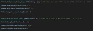 I set the bit rate to 500k/2M and the sample points to 70%/75%.