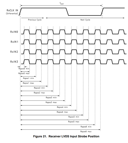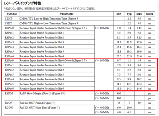 In the datasheet for the channel link IC device "DS90CR285, DS90CR286," the RSPos* for f=66MHz is listed in the red frame in the receiver switching characteristics below. The min and max values of the sampling points during this 7-bit transmission are specified in increments of 2.2nsec. However, at 66MHz, it is thought that the increments are 2.165nsec, and it is thought that the deviations will increase toward the latter half of the bit. (The deviation is about 0.21nsec for the 7th bit) As a result, it seems that the eye pattern is getting tighter in the latter half of the bit, as previously reported. This is listed as a rounded value as a standard value, and is it true that the receiving sampling point is actually a little further forward in the latter half of the bit?