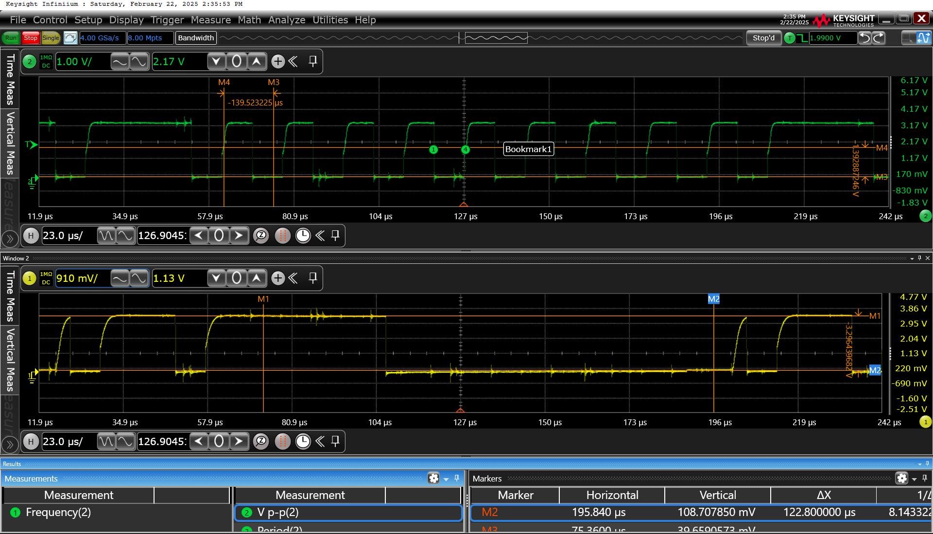 In this example, the ACK bit is sampled at 196 µs. The ACK bit was driven low by the slave, while the following low level is driven by the master in order to send the stop condition. While the switch-over between slave and master happens, the SDA line might go high for a short time; this is normal and not a problem.