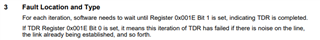 "TDR can also be run manually using bit[15] in the Cable Diagnostic Control Register (CDCR, address 0x001E). Cable diagnostic status is obtained by reading bits[1:0] in the CDCR. Additional TDR functions including cycle averaging and crossover disable can be found in the Cable Diagnostic Specific Control Register (CDSCR, address 0x0170). TDR [..] store the results in the respective TDR Cable Diagnostic Location Result Registers #1 - #5 (CDLRR, addresses 0x0180 to 0x0184) and the Cable Diagnostic Amplitude Result Registers #1 - #5 (CDLAR, addresses 0x0185 to 0x0189)."