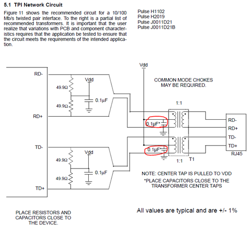 our design guideline of datasheet say below but they can't add the 0.1uF cap to the transformer center tab of each difference communication pair and have to add the 0.1uF cap all at once due to new type RJ45.