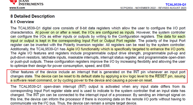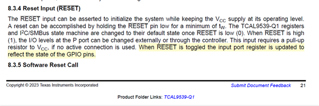 Q3: In DS 8.3.4 : “When RESET is toggled the input port register is updated to reflect the state of the GPIO pins.”