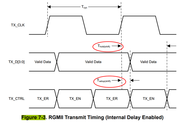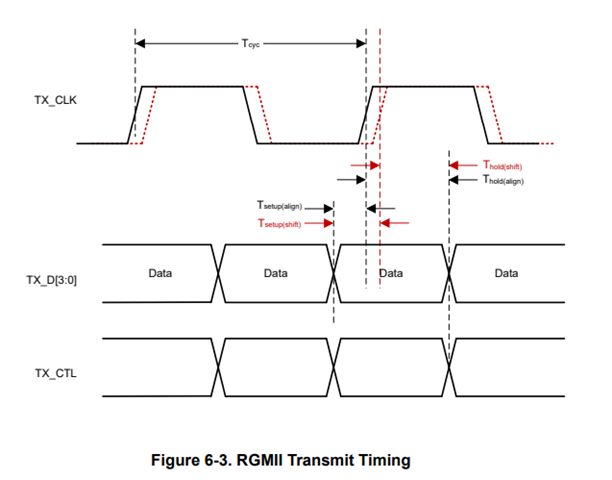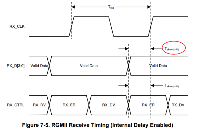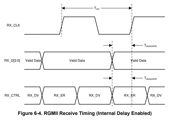 A minimum of 1ns setup and 1ns hold time must be maintained at the input of the receiver. In RGMII RX shift mode, the PHY shifts RX_CLK ahead of RX_Data signals by roughly 3ns.