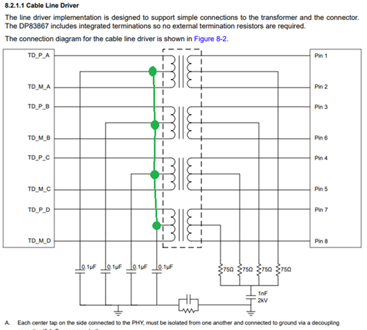 Referring to the datasheet link below at page-105, Figure 8-2 show that the center tap of transformer had independent connection closed to PHY side. But we found some other solutions wired all center taps together. Our questions are as followers