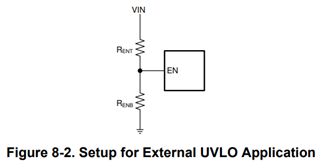 Please refer to section: 8.2.3.9 External UVLO data sheet to find the values of Resistors.