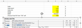 Hi, thanks for quick check. Can you help me with an example. and what is the VEN-VOUT and VEN-HYS values to consider. I have calculated for VON 8V. the result obtained is not matching with the Web Bench. please share the RENB and RENT values for the VON =8V and VOFF = 7.5V