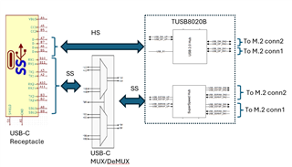 I need to connect two M.2 connectors with their respective USB signals (2.0 and 3.0) to a single USB Type-C connector. This USB-C connector is a upstream-facing port (UFP).