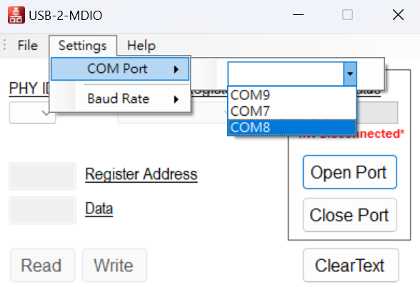Typically the highest COM port, in this case, COM9, should be used and Baud Rate is 9600.