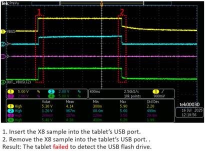 Using TUSB4020BIPHPR HUB to analyze, after inserting DUT, the waveform of USB UP PORT is measured as shown below. The D+ waveform is continuously H, the function is abnormal, and the USB device cannot be recognized.