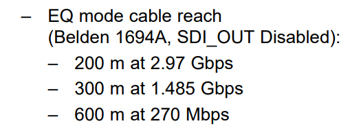 LMH0397 datasheet shows when it work as a receiver at EQ mode, cable length can reach 200m at 2.97Gbps (with Belden1694A cabel)