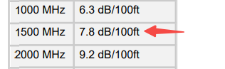 Refer Belden1694A datasheet,the cabel attenuation at 1.5GHz is 7.8dB/100ft (25.7dB/100m)