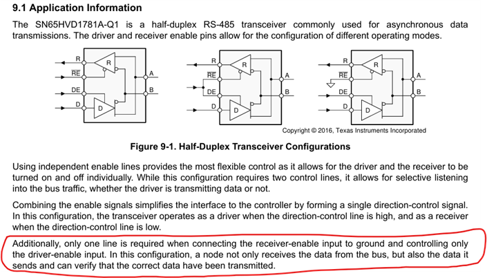 as per data sheet, suppose to get the loopback signal from the pin 1 (R-Receive) of SN65HVD1781A-Q1. but not getting any out on Pin 1 when checking for loop back. but when RS422 signal provided to Pin A and B the UART signal is available in pin 1 of SN65HVD1781A-Q1.