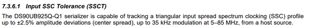 1. Does the DS90UB925Q-Q1 support spread spectrum modulation (SSC)? The datasheet mentions that the DS90UB925Q-Q1 supports SSC.