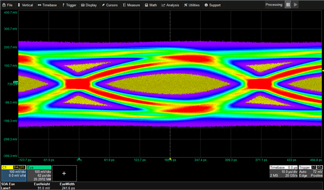 This all would point to a signal integrity issue in the main link, probably on lane 1, but looking at lane 0 and 1 the eye seems to be good enough. The measurement was done directly on the eDP connector.