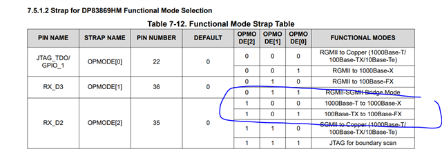 Hello TI team! In short, we have attempted to operate the DP83869HM in simple copper to fiber (SFP module) media converter mode. I have included the hardware strap configuration below.