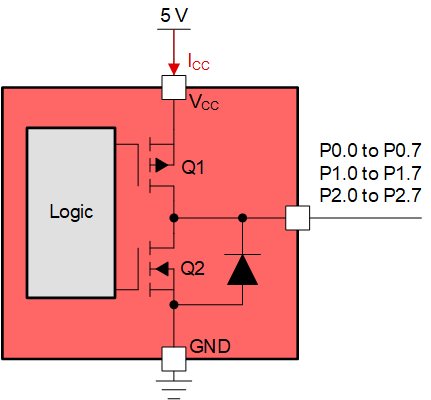 Q1 and Q2 make up the push-pull output structure of the I/O expander. There is an ESD protection diode on the I/O that points from GND to the I/O pin. Q2 is an n-type MOSFET while Q1 is a p-type MOSFET. Both transistors are used to create the high and low logic outputs out to the I/O pins P0.0 - P2.7.