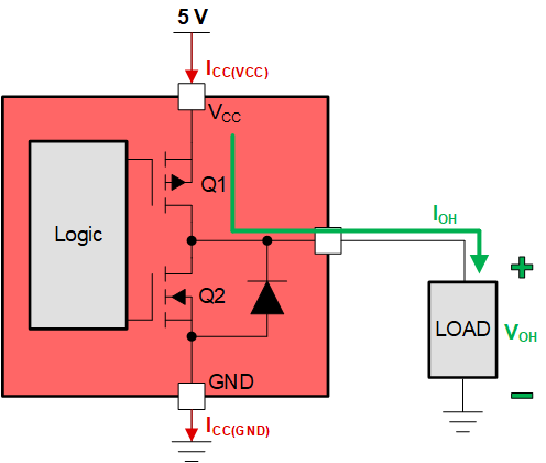 For example, when driving an output HIGH, Q1 is enabled while Q2 is disabled. Q1 pushes current out of the pin by driving the pin towards VCC. VOH is the output HIGH voltage while IOH is the output HIGH current being sourced.
