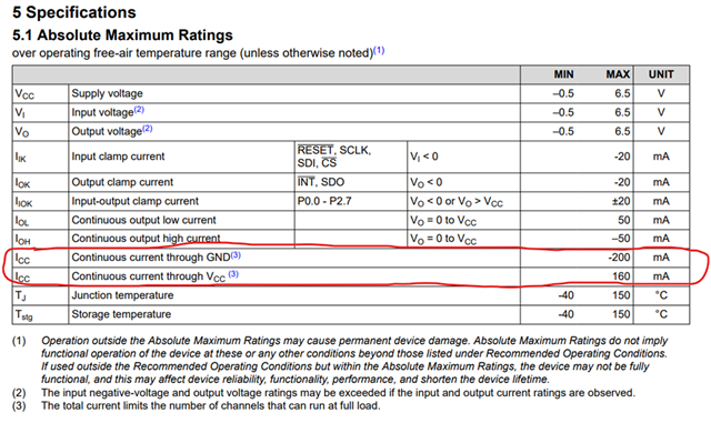 The high-lighted specs are ICC - continuous current through GND, and ICC - continuous current through VCC. These spec's are critical to consider because I/O expanders can have many pins configured to OUTPUT where several loads are being driven at a single time.
