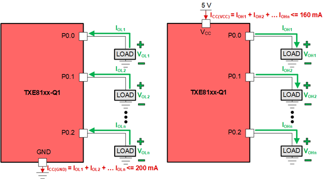 The examples above was showing a single I/O pin driving an output and sinking/sourcing a current through a load. When using TXE8116, TXE8124, or TXE8148, there can be 16 / 24 / 48 outputs simultaneously driving a load. If these total currents exceed the absolute maximum ratings for VCC or GND, potential damage may occur to the device.