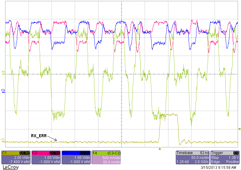 RX_ERR in channel 1 is pin 41 output signal. Channel 2 and 3 are RX+ and RX- signals. Trace F4 is the difference between RX+ and RX-