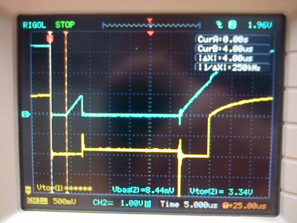 This picture attached shows CH2 (blue) on top as the TX from the Micro into the CAN Controller (Pin1 "D") and CH1 (yellow) on the bottom out the CAN Controller (Pin6 "CANL"). The cursor shows CH2 (blue) driving low for 4us, releasing for 4us, then driving again for 24us. What is it doing but more importantly, why does the CAN line (CH1 (yellow)) go to an intermediate voltage? Is it also trying to drive?