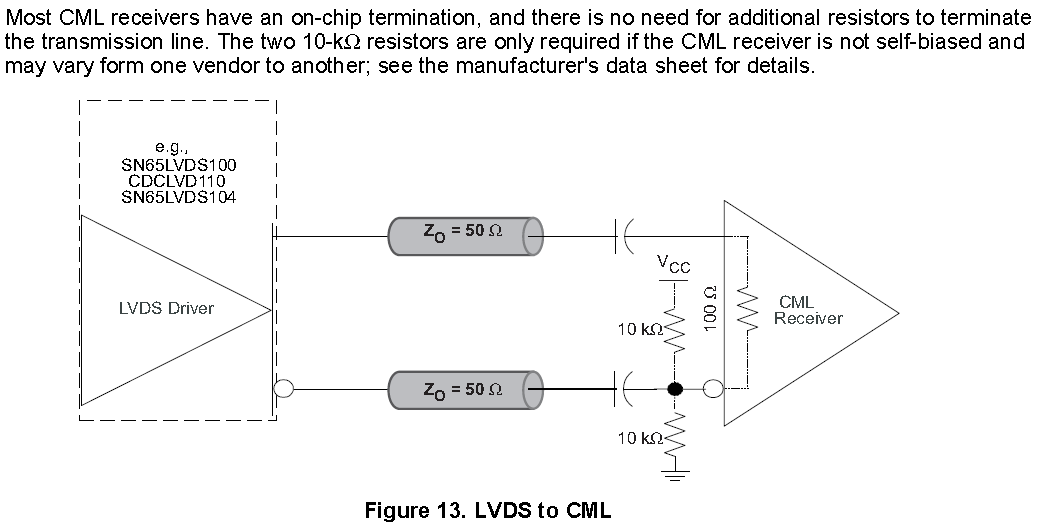 3) The 10kOhm can be omitted if the CML receiver inputs are internally biased.
