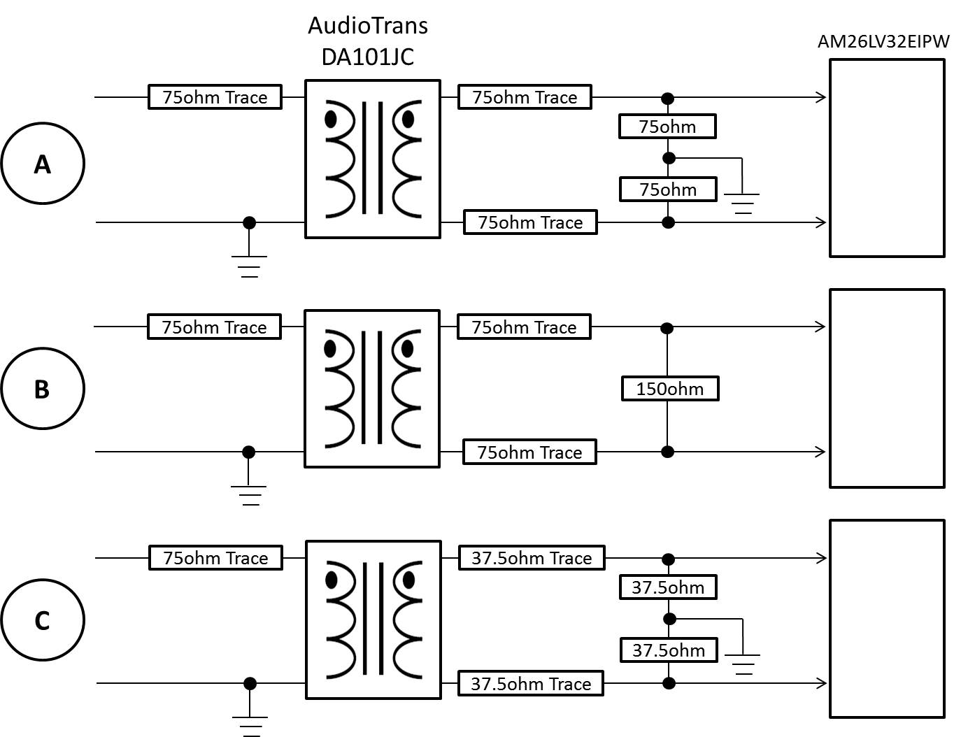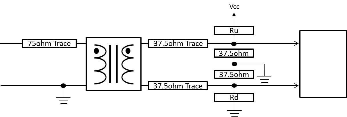 >I would like to see the 75 ohm resistors replaced with two 37.5 ohm resistors and the center tap grounded. Gives a input common mode of zero instead of floating.