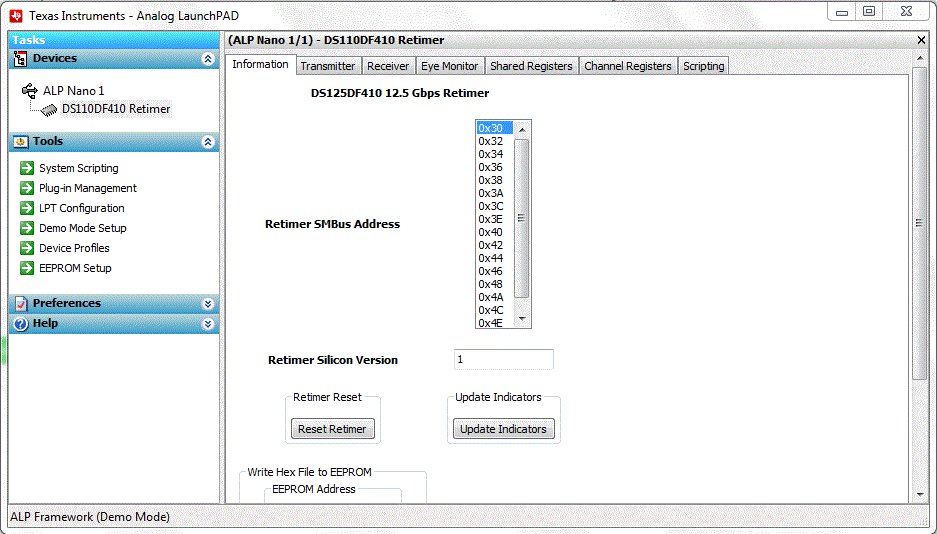 We are currently designing a PCB with the DS100DF410 retimers. We would like to use the available software (Analog LaunchPAD) to configure and monitor (e.g. eye opening) our retimers. Please see the figure below.