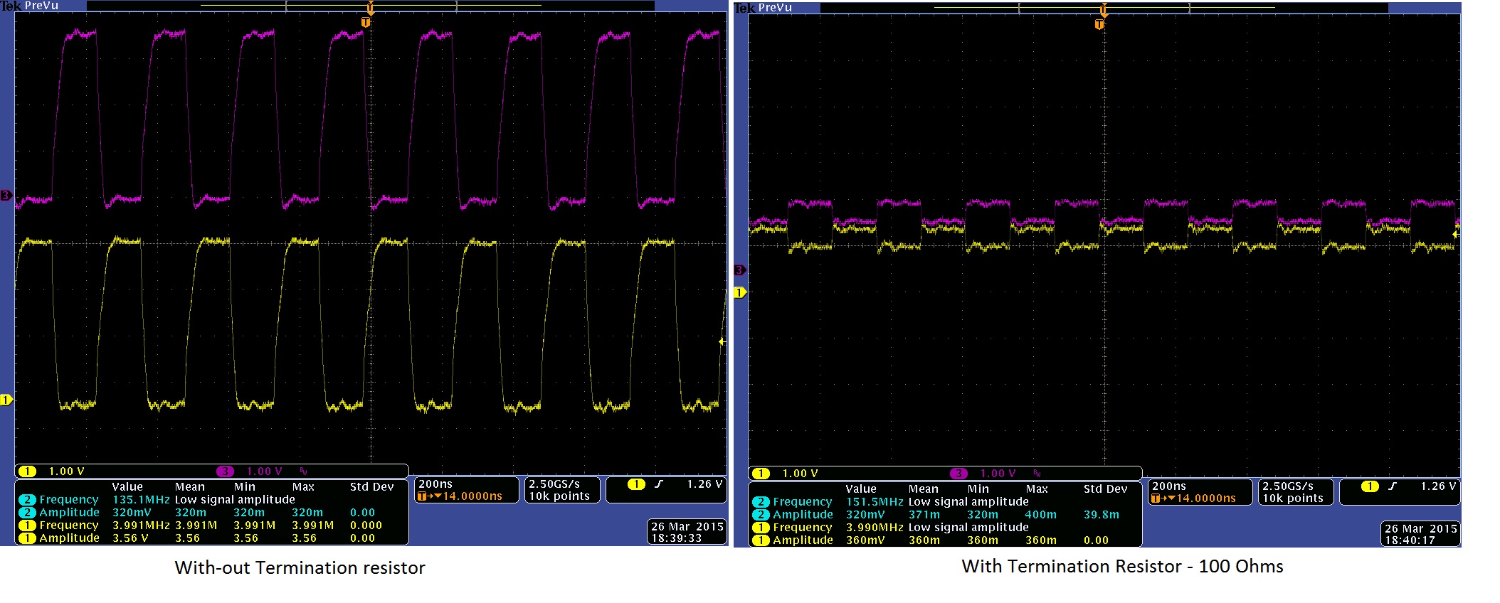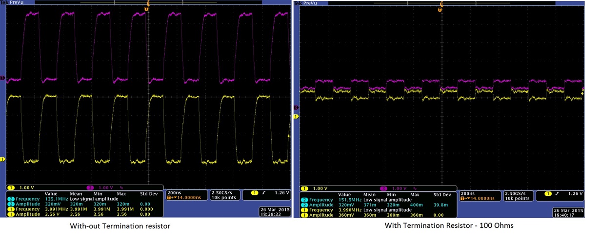 Observation: Both Dout+ and Dout- are giving pulses of 3.3V amplitude (but Inverted). When i terminate with 100 Ohms resistor (Receiver not connected), amplitude decreased to 1.5V. Please see attached wave forms.