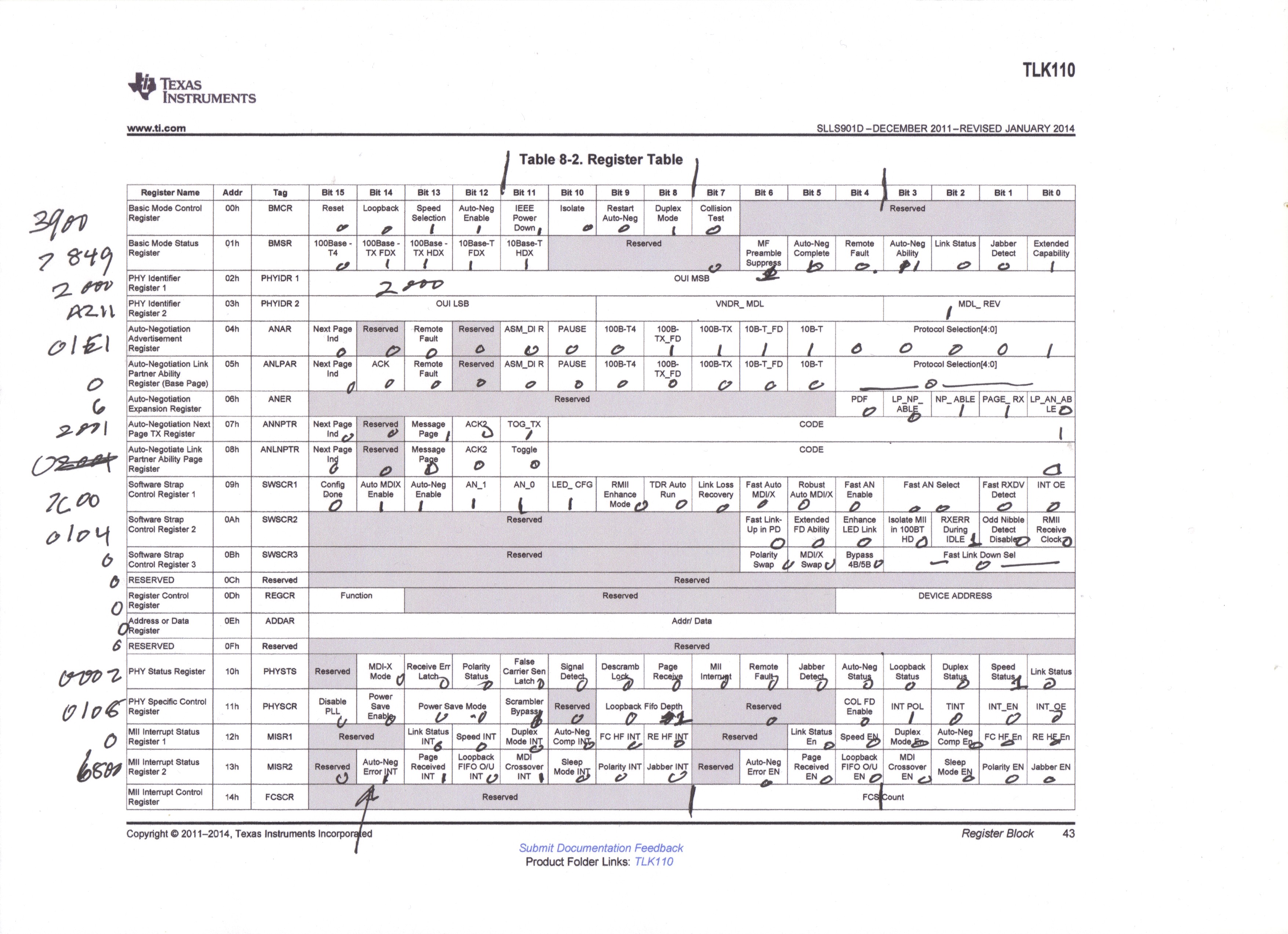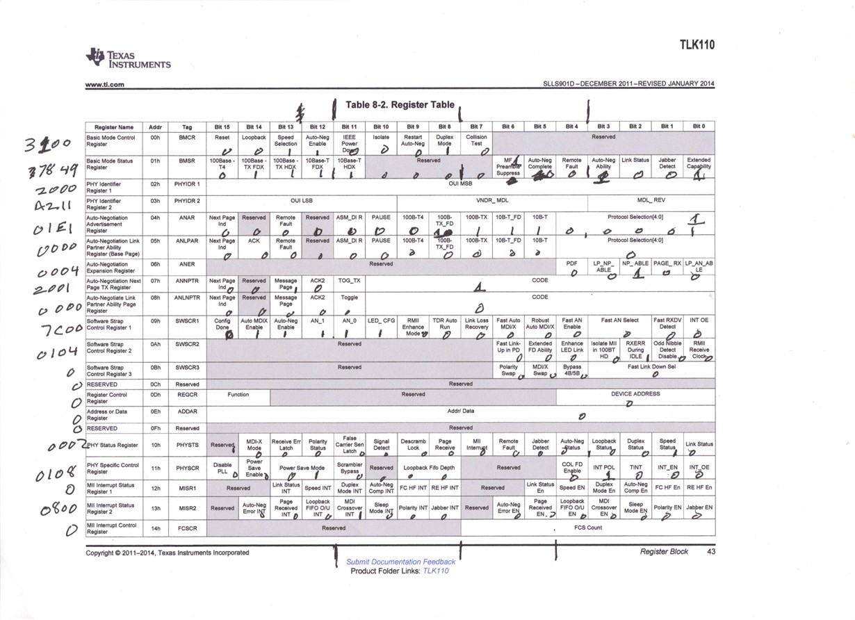 I have a board with the TLK110 wired as per the attached schematic. (The circuit on the left is an ATMEL ATSAM4E) J11 contains magnetics as well as the connector.
