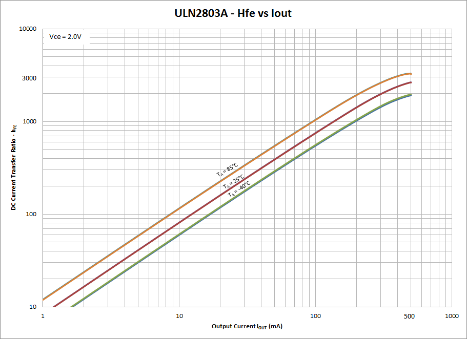 Please disregard Figure 3. It is incorrect, and we are working to update this datasheet. Please see the data below for Hfe value of the ULN2803 across temperature.