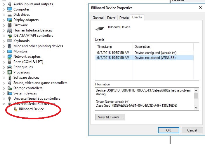 My 2nd device is Alpine Ridge DP with dual thunderbolt ports and self-powered. I also connect it to normal USB to test billboard function. The billboard device occurred on windows10 device manager but with an exclamation mark. How to fix it?