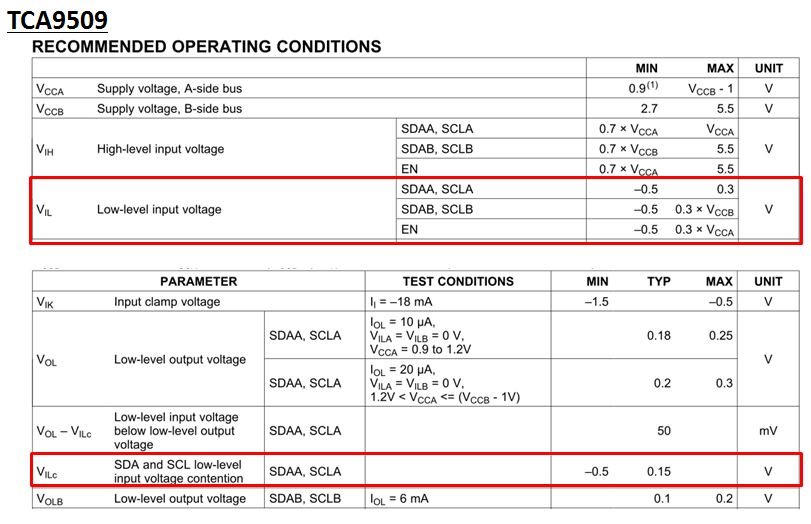 Regarding the datasheet specification below, V_IL of A-side is -0.5V to 0.3V. On the other hand, V_ILC = 0.15V(TYP). For the device to function correctly, I believe V_IL requires low level voltage lower than 0.15V (TYP) instead of 0.3V on A-side of the device.