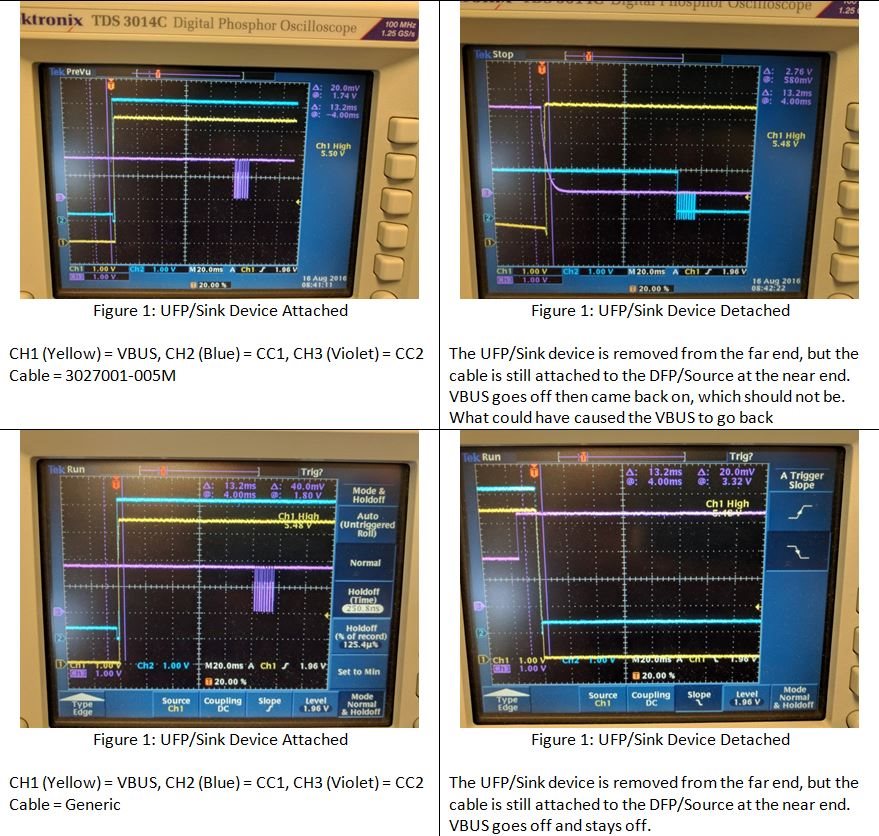 I'm using the TPS65982 to output 3 variable outputs, 5V, 12V and 20V. When I used a type-C to type-C cable PN# 3027001-005M, bought from Digi-Key, the 5V doesn't get shut off when the device is removed, but the cable is still attached to the TPS65982 charger. If the cable is removed, then the 5V is shut off. I have never seen it behave this way at 12V or 20V. Has anyone see this issue? How can I prevent this? Are there differences in type-C cables. when I use a generic cables from Amazon, they don't exhibit this behavior.
