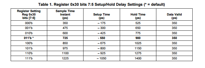 - Another question was regarding this timing app note. In 'Section 3: Serializer Register Programmability' it shows this table and identifies the default register setting for sample and hold times: