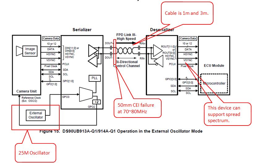 My customer is using DS90UB913A/914A to transfer the video signal, and doing EMC CEI test, customer has used one 25M oscillator at 913A side, and the block diagram is as below.