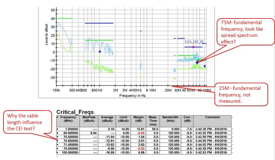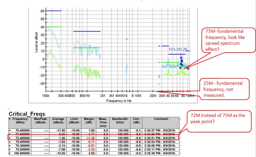 1.At 1m cable test result, Is the 75M failure frequency band caused by spread spectrum of 914A, because this is not like a signle point frequency.
