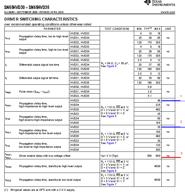 A DE=1 to Y,Z valid =~ 30 ns matches to the datasheet (SLLS665I –SEPTEMBER 2005–REVISED APRIL 2010) page 6, marks 1 and 2